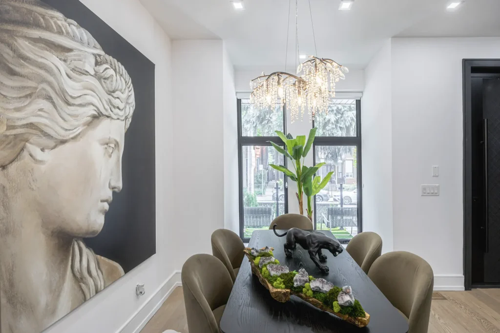Designed For Formal Entertaining, The Dining Room Exudes Sophistication With Floor-To-Ceiling Picture Windows And A Stunning Statement Chandelier — Creating An Elegant Space Perfect For Hosting Unforgettable Gatherings.