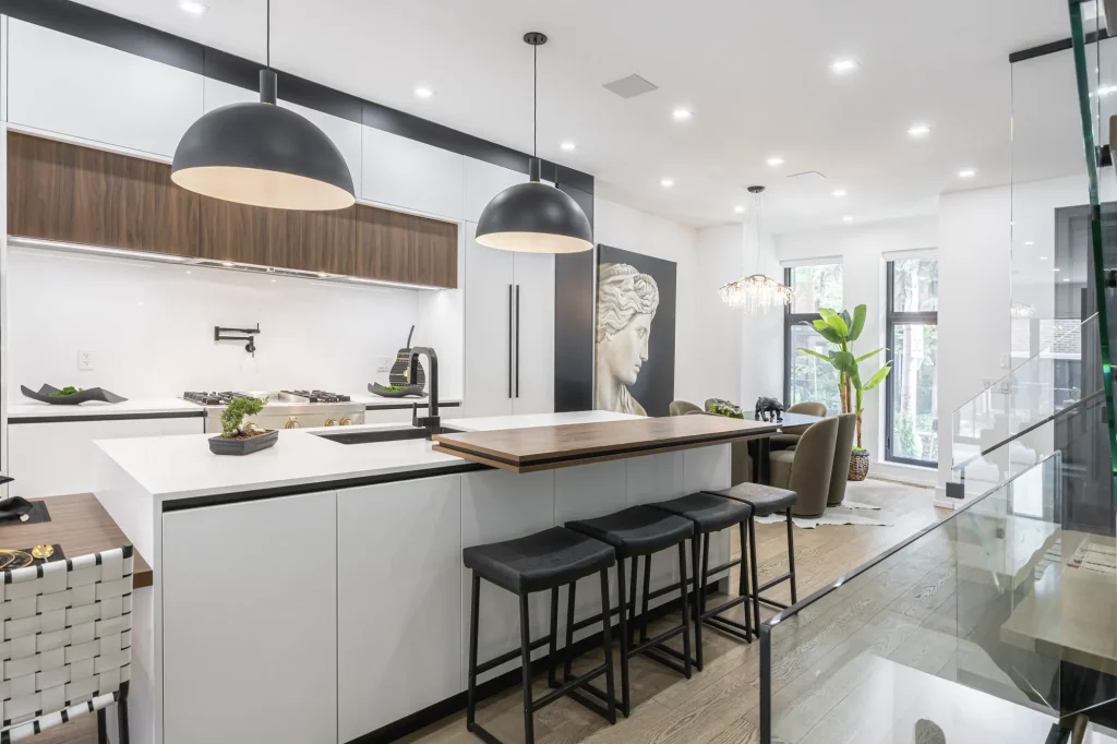 At The Heart Of The Home Lies The Chef-Inspired Kitchen — A True Showpiece. A Dramatic Stone Waterfall Island Commands Attention, Surrounded By Top-Tier Industrial-Grade Appliances, Island Designer Chandeliers And Extensive Italian-Imported Custom Cabinetry. The Adjacent Eat-In Area Provides Tranquil Views Of The Private Backyard Oasis, While The Family Room,Adorned With Bespoke Millwork Offers The Perfect Setting For Everyday Living.